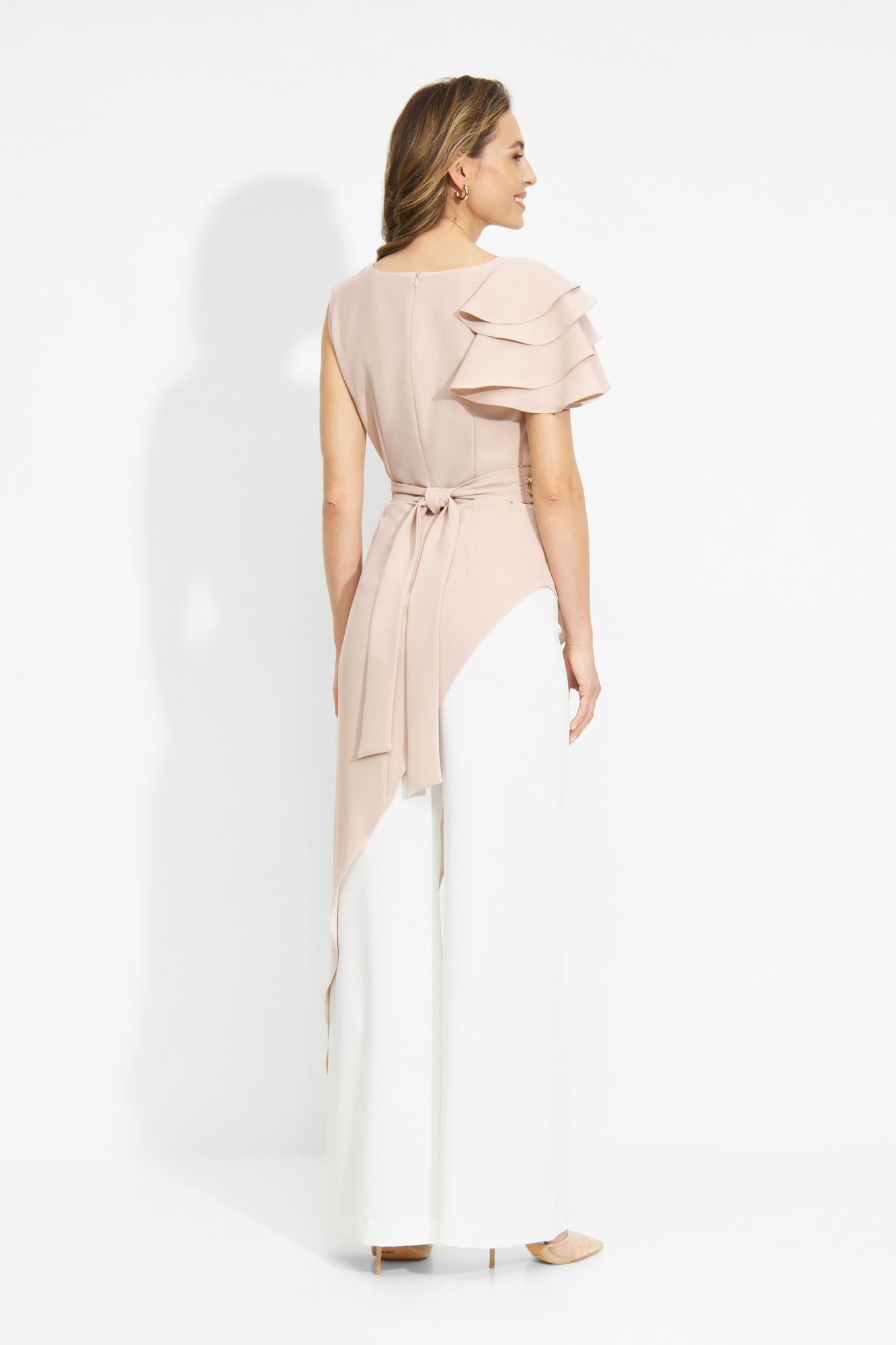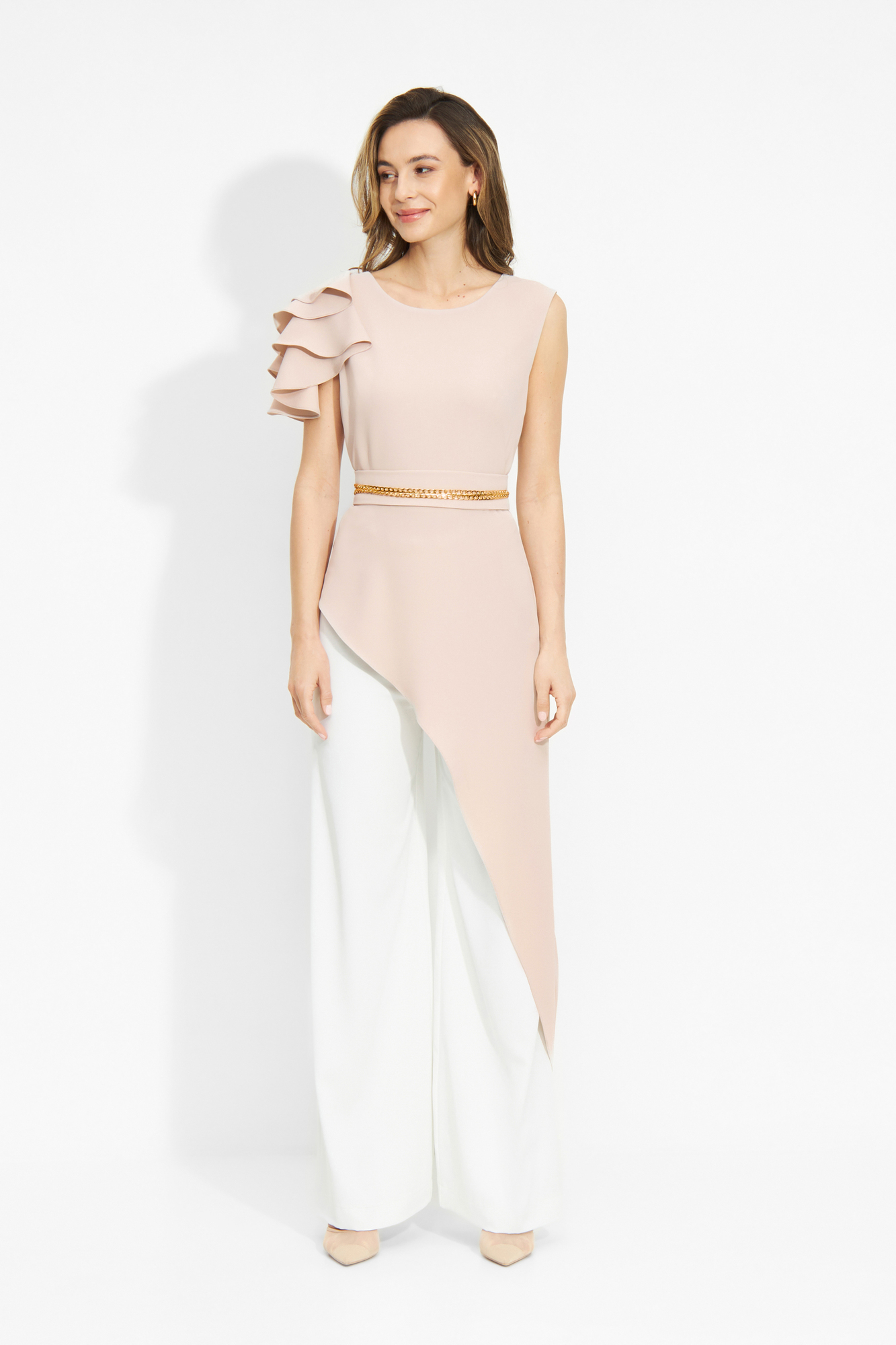 Asymetryczna bluzka przyciąga spojrzenia i nadaje całości lekkości. Pasek w talii podkreśla sylwetkę i porządkuje proporcje. Pudrowy róż wprowadza miękkość i elegancję, pięknie rozświetlając całą stylizację.