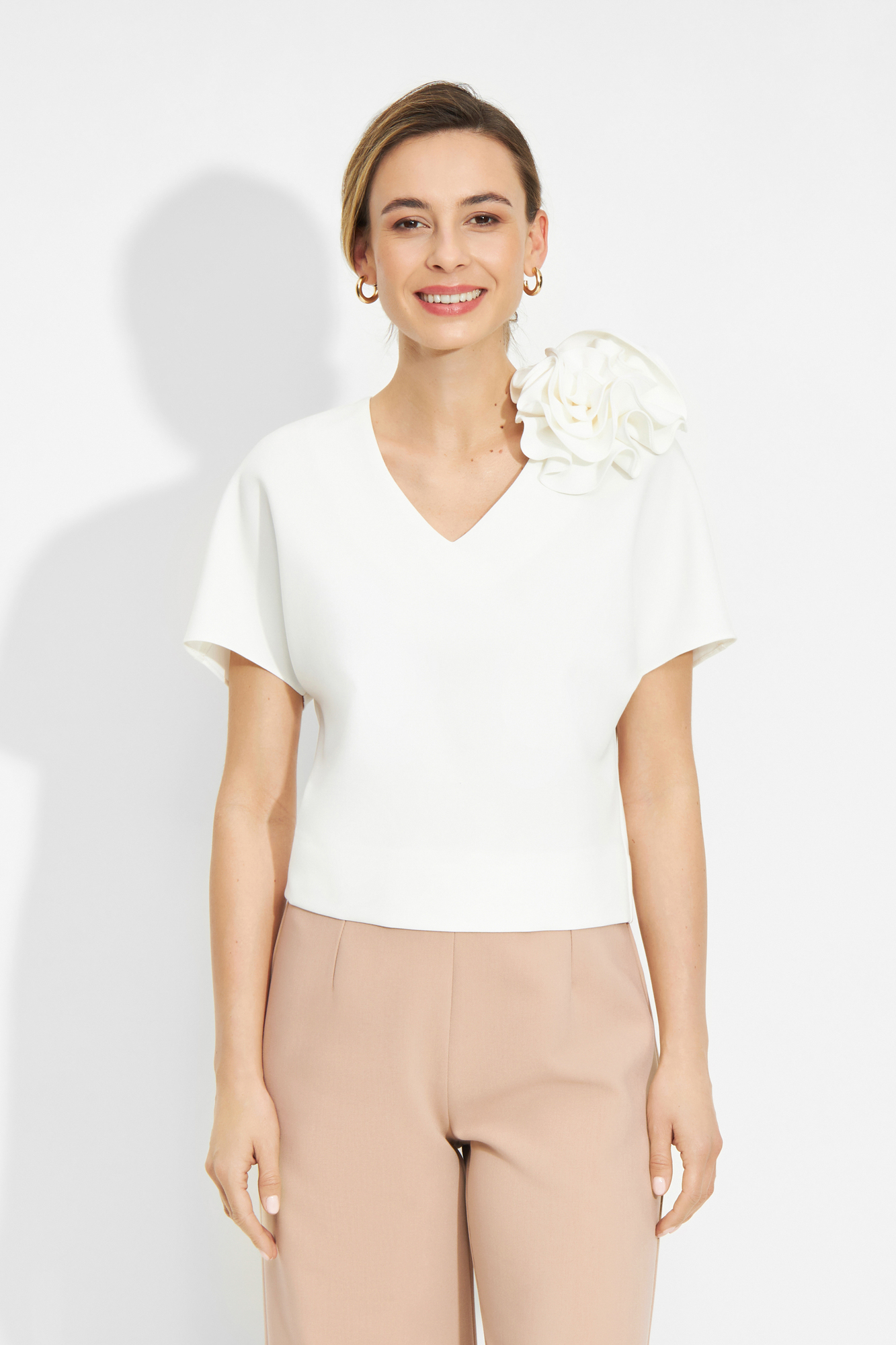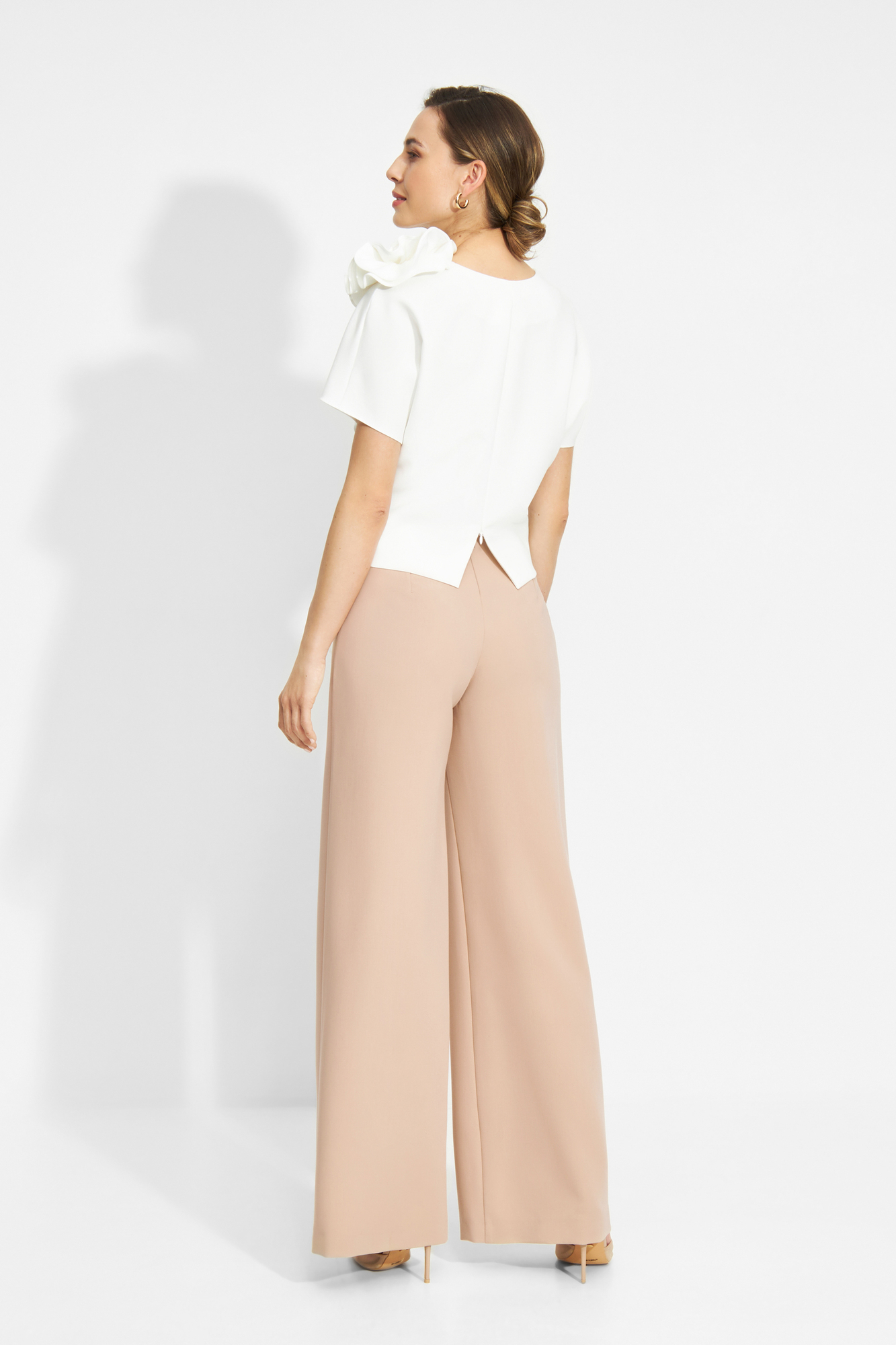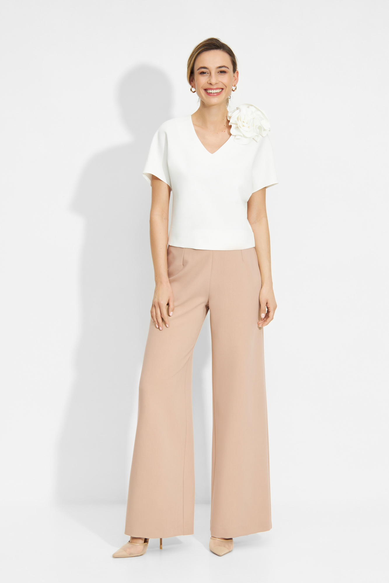 LILA – Komplet bluzeczka z dekoltem w serek, dopinanym kwiatem i szerokimi spodniami