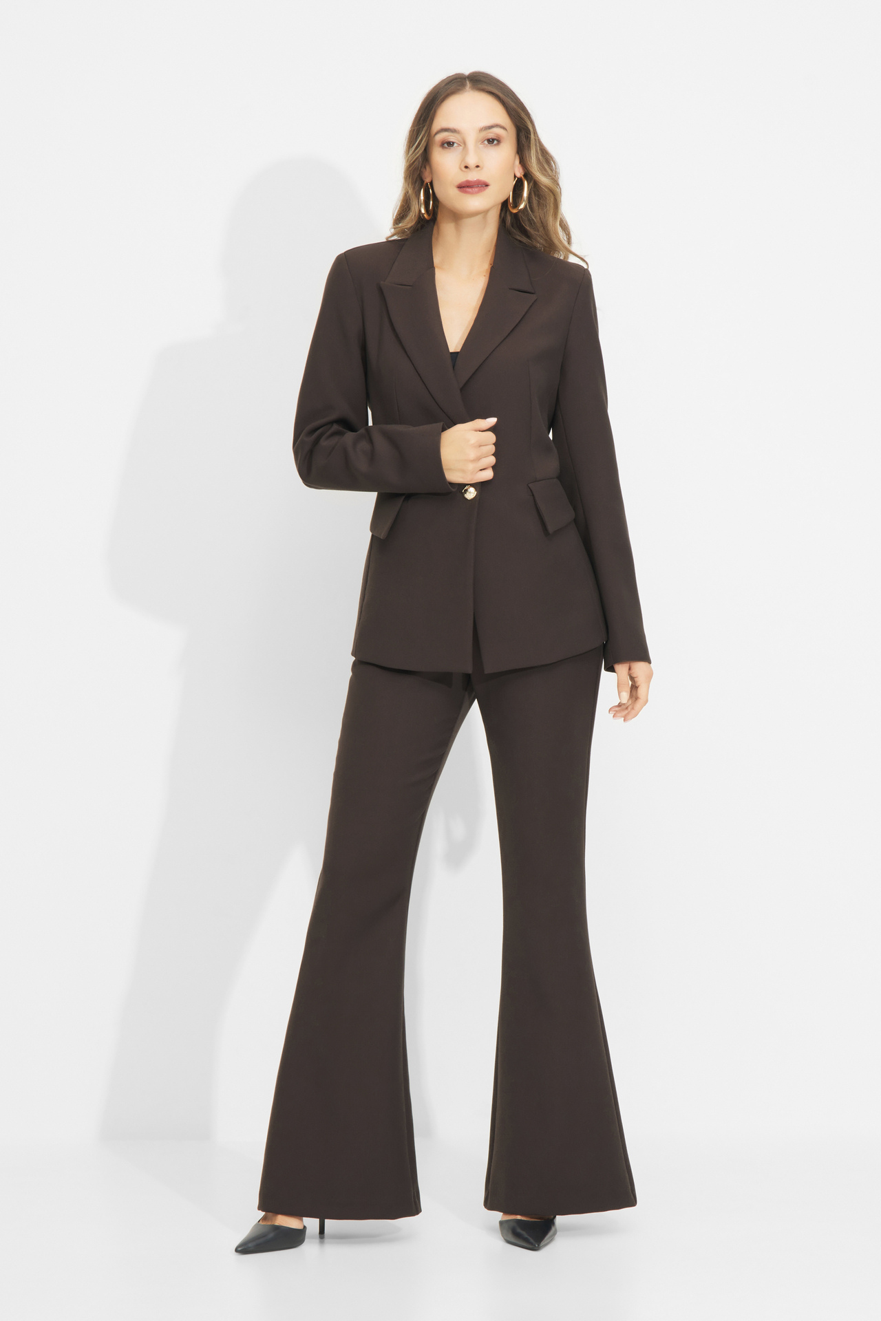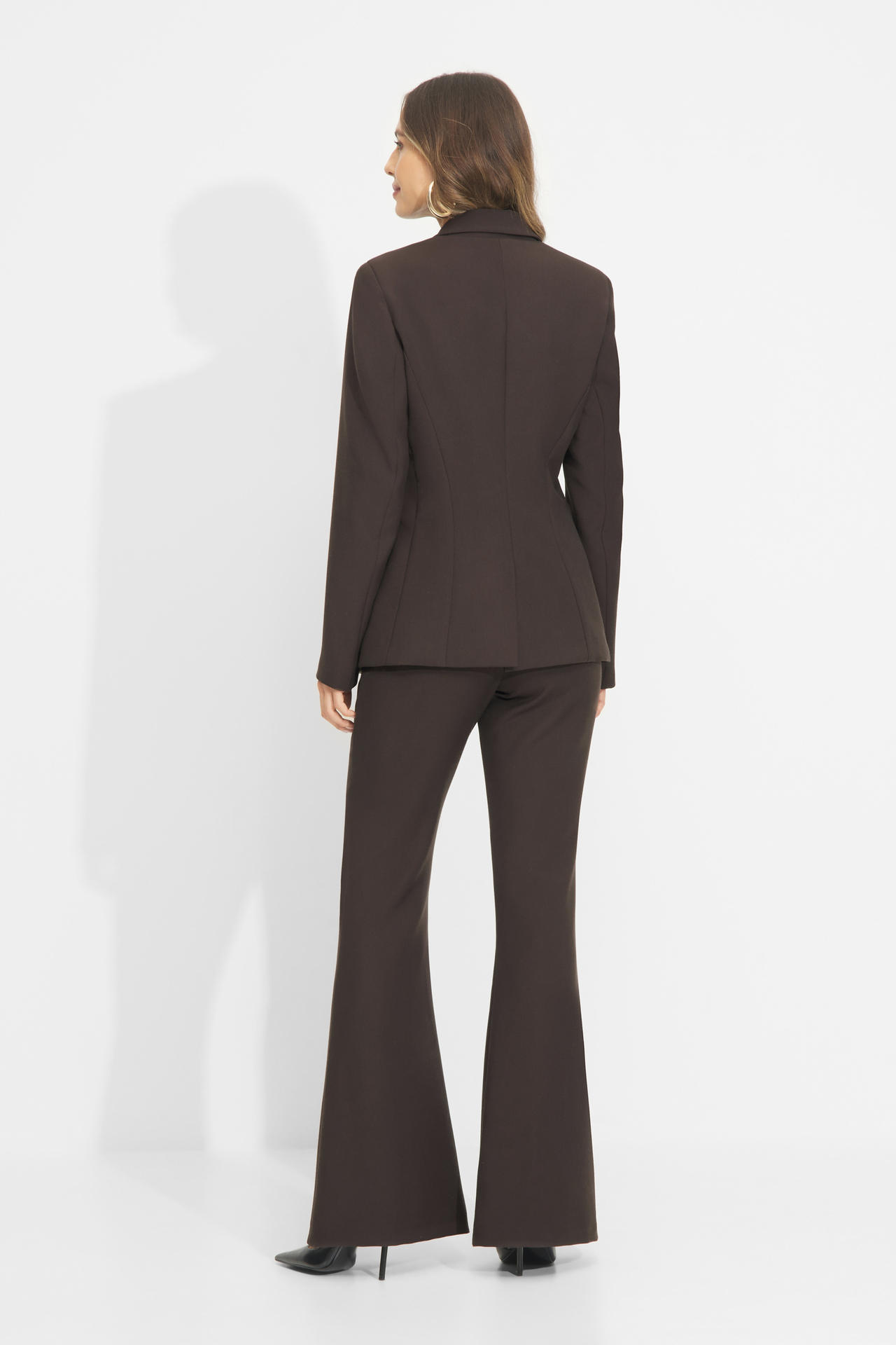 WILLOW – Komplet składający się z brązowego żakietu zapinanego na guzik i dopasowanych spodni z rozszerzanymi nogawkami